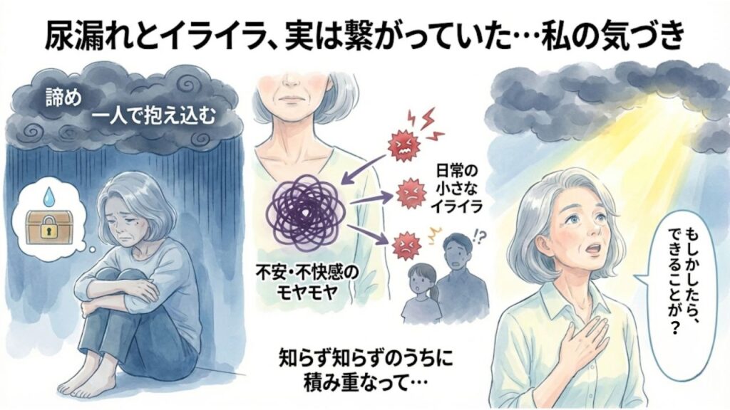 正直なところ、尿漏れのことと、私が抱えていたイライラがこんな風に繋がっているとは、あの頃は思っていませんでした。不安や不快感が積み重なって、心のどこかに常にモヤモヤがあった。